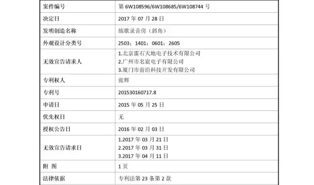 8月2日,國家知識產(chǎn)權局專(zhuān)利復審委員會(huì )(下稱(chēng)專(zhuān)利復審委)公布第32945號專(zhuān)利無(wú)效宣告決定,宣告張輝持有的第201530160717.8號“練歌錄音房(斜角)”外觀(guān)設計專(zhuān)利全部無(wú)效,而該該件專(zhuān)利恰恰為億元索賠案的涉案專(zhuān)利。筆者還發(fā)現專(zhuān)利無(wú)效的原因可能是由于涉案外觀(guān)設計早在申請日之前,既已被網(wǎng)絡(luò )報道公開(kāi)。也就是說(shuō)無(wú)效宣告請求人僅用一篇網(wǎng)絡(luò )報道,便無(wú)效掉了涉案專(zhuān)利。