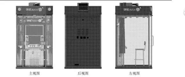 涉案專(zhuān)利由主視圖、后視圖、俯視圖、左視圖、右視圖和使用狀態(tài)參考圖表示,簡(jiǎn)要說(shuō)明記載省略仰視圖。如圖所示,涉案專(zhuān)利整體近似長(cháng)方體,長(cháng)寬高比例約為1:1:2,從俯視圖觀(guān)察整個(gè)產(chǎn)品正面呈形,左邊1/5和右邊1/5為斜切面,涉案專(zhuān)利頂部1/6為頂棚,頂棚頂部有一些凸出的結構和部件,頂棚正面和左右側面分別有“咪噠miniK”的文字及近似音符的圖案,斜切面上有微凸的正方形,內有“⑧”圖案,涉案專(zhuān)利底部為較薄的底板,頂棚和底板間面與面的銜接處均為框架結構,除了背板,框架間均為透明玻璃,玻璃頂部和底部均有大量小圓點(diǎn)圖案,正面中間為玻璃門(mén),其左部裝有“]”形把手,涉案專(zhuān)利背面有一些孔、洞結構。玻璃房?jì)?,頂棚靠近背板的一側裝有三個(gè)斜向圓柱形筒燈,靠近正面和左右側面的位置各裝有三個(gè)豎向的筒燈,背板頂部為長(cháng)方形坡面,其中間為“咪噠miniK”的文字及近似音符的圖案,左右兩邊各有一些卡通圖案,坡面下方左邊1/5和右邊1/5分別有豎條形的結構,其頂部各有一掛鉤,掛有一 “C”形耳機,坡面下方中間為娛樂(lè )主機,從側面看主機上部較薄,為屏幕,主機中部逐漸由薄變厚,正面為斜面,斜面中間有一屏幕,屏幕左右兩邊各有一麥克風(fēng),主機下部較厚,其頂部有一半突出的操控臺,操控臺上有三個(gè)圓形大旋鈕及其他操控件,操控臺下方有一長(cháng)方形機箱門(mén),機箱門(mén)下方亦有一長(cháng)方形散熱區域,主機左右兩邊各有一小桌板,桌板下有豎直的支撐桿,玻璃房?jì)冗€有兩把相同的高腳椅,椅子均有四條椅腿,椅背呈長(cháng)方形,通過(guò)三根連接桿與椅座相連,玻璃房左右側面設有窗簾。詳見(jiàn)涉案專(zhuān)利附圖。
