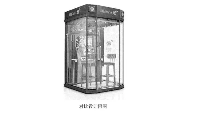 對比設計公開(kāi)了 1幅視圖,如圖所示,對比設計整體近似長(cháng)方體,長(cháng)寬高比例約為1:1:2,左邊1/5和右邊1/5為斜切面,整個(gè)正面呈形,對比設計頂部1/6為頂棚,頂棚正面和左側面分別有“咪噠miniK”的文字及近似音符的圖案,斜切面上有微凸的正方形,內有“⑧”圖案,對比設計底部為較薄的底板,頂棚和底板間面與面的銜接處均為框架結構,除了背板,框架間均為透明玻璃,玻璃頂部和底部均有大量小圓點(diǎn)圖案,正面中間為玻璃門(mén),其左部裝有“]”形把手,門(mén)中間有近似音符的圖案和“咪噠miniK”等文字圖案設計。玻璃房?jì)?,頂棚靠近背板的一側裝有三個(gè)斜向圓柱形筒燈,靠近正面和左右側面的位置各裝有三個(gè)豎向的筒燈,背板頂部為長(cháng)方形坡面,其中間為“咪噠miniK”的文字及近似音符的圖案,左右兩邊各有一些卡通圖案,坡面下方左邊1/5和右邊1/5分別有豎條形的結構,其頂部各有一掛鉤,掛有一 “C”形耳機,坡面下方中間為娛樂(lè )主機,從側面看主機上部較薄,為屏幕,主機中部逐漸由薄變厚,正面為斜面,斜面中間有一屏幕,屏幕左右兩邊各有一麥克風(fēng),主機下部較厚,其頂部有一半突出的操控臺,操控臺上有圓形大旋鈕,操控臺下方有一長(cháng)方形機箱門(mén),機箱門(mén)下方亦有一長(cháng)方形散熱區域,主機左右兩邊各有一小桌板,桌板下有豎直的支撐桿,玻璃房?jì)冗€有兩把相同的高腳椅,椅子均有四條椅腿,椅背呈長(cháng)方形,通過(guò)三根連接桿與椅座相連,玻璃房左右側面設有窗簾。詳見(jiàn)對比設計附圖。