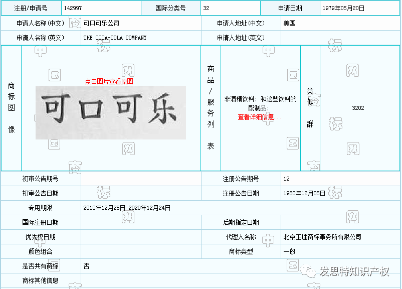 從可口可樂(lè )公司的商標注冊情況來(lái)看,多數商標都注冊在其1979年重返中國市場(chǎng)之后,比如這個(gè)“可口可樂(lè )”商標,申請的時(shí)間就為1979年5月。(1979年中美建交,之前可口可樂(lè )曾隨著(zhù)美國大使館撤離一同“撤離”中國市場(chǎng))