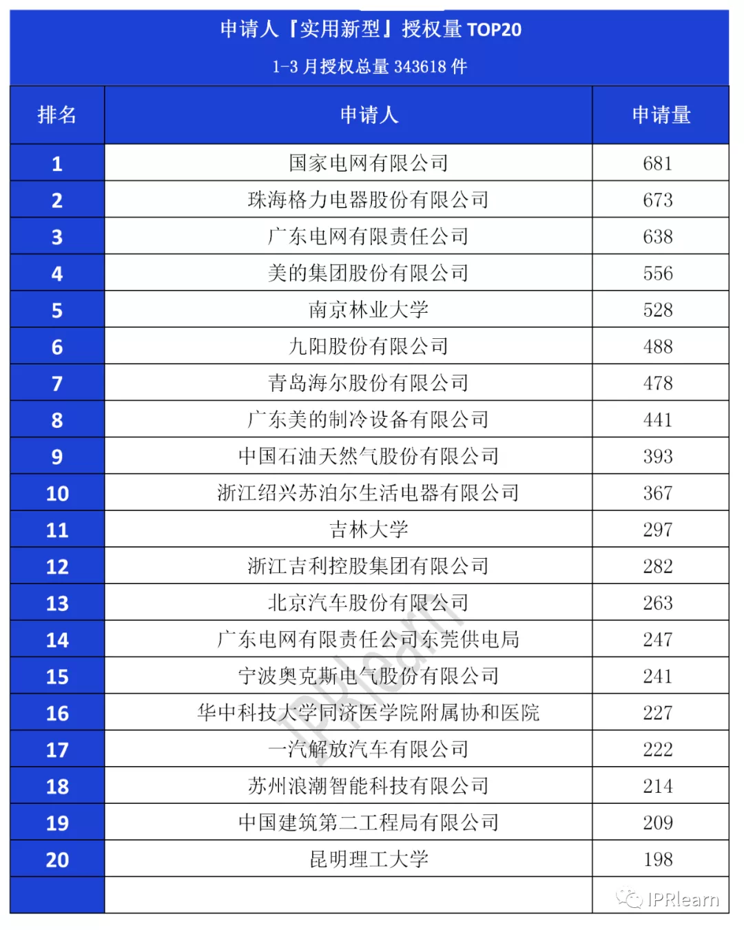 1-3 月,我國實(shí)用新型專(zhuān)利申請 56.4 萬(wàn)件,實(shí)用新型專(zhuān)利授權 34.4 萬(wàn)件。截至 2020 年 3 月底,實(shí)用新型專(zhuān)利有效 量為 545.2 萬(wàn)件。