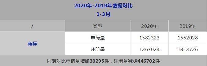 2020 年 1-3 月,我國商標申請量為 158.2 萬(wàn)件,商標注冊量為 136.7 萬(wàn)件。截至 2020 年 3 月底,有效注冊商標量 2638.2 萬(wàn)件。